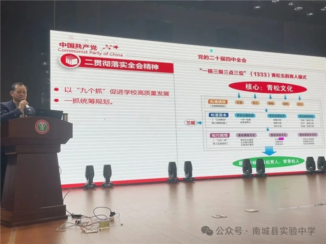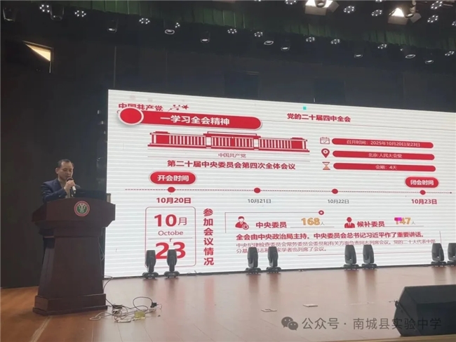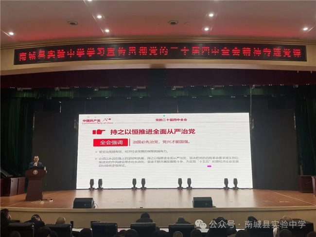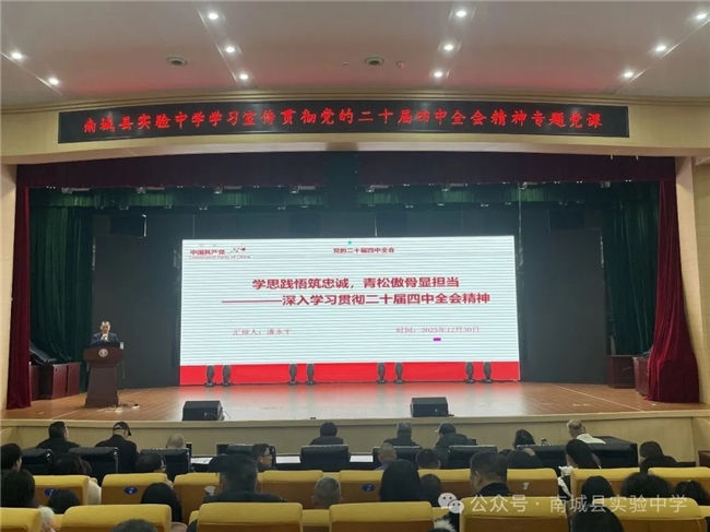 为深入学习领会党的二十届四中全会精神,切实把党员、干部的思想和行动统一到党中央决策部署上来,2025年12月30日下午,南城县实验中学党委书记潘永平在松华厅讲授了一堂题为“学思践悟筑忠诚,青松傲骨显担当”的学习贯彻二十届四中全会精神专题党课。本次党课由党委委员、副校长胡秋萍主持,全体党员、干部齐聚一堂,共同汲取思想养分,凝聚奋进力量。