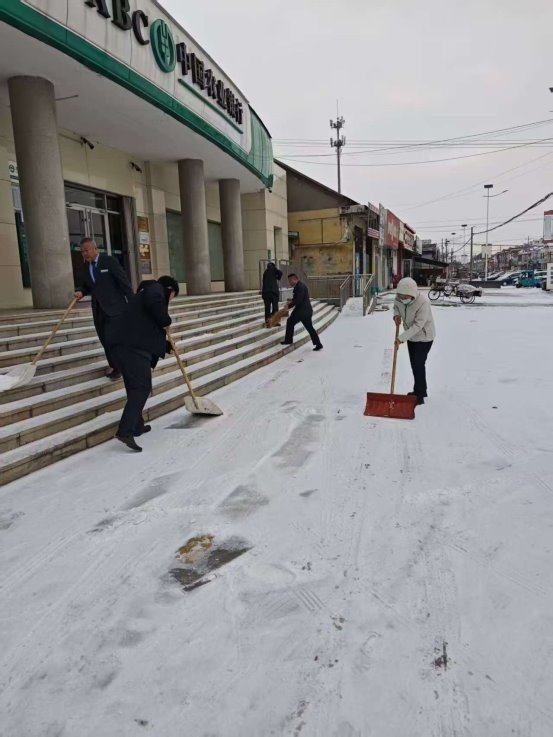 雪后一早,支行员工便提前到岗,主动拿起铁锹、扫帚、推雪板等工具,对网点门前台阶、人行道、坡道及周边通行区域的积雪和薄冰进行全面清理。大家不畏严寒、分工协作,有的奋力铲冰破雪,有的细致清扫路面,还有人专门在易滑区域铺设防滑垫、摆放安全提示牌,不放过任何一处安全死角。清扫过程中,员工们始终干劲满满,即便双手冻得通红,也丝毫没有懈怠,用最快速度清理出一条安全通畅的便民通道。