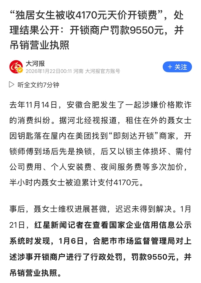 据各方新闻报道,202X年,广州一名市民因门锁故障求助,被上门开锁人员索要980元“技术费”,且无法提供发票与资质证明;另据《大河报》披露独居女生被收4170元天价开锁费”,处理结果公开:开锁商户罚款9550元,并吊销营业执照。此类事件屡见不鲜,暴露出当前开锁市场“无证经营、价格虚高、服务无保障”,