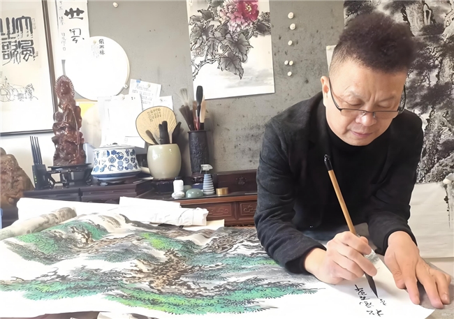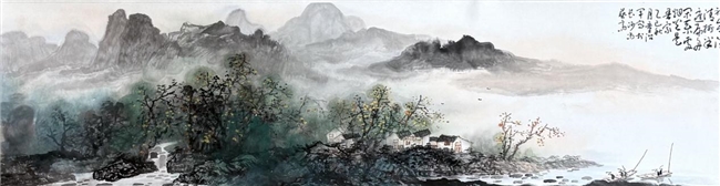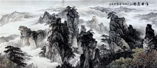 童治军以丹青为舟楫,在传统与创新的激流中溯游而上。他的笔锋如龙蛇走壁,时而苍劲如松柏裂石,时而婉转似云岫含烟,将中国山水画的"三远法"化为胸中丘壑——高远之势若雷霆劈空,深远之境似幽谷回音,平远之韵如江天暮雪。这不仅是技艺的淬炼,更是对北宋郭熙"林泉高致"的当代诠释,每一处皴擦点染皆暗合谢赫六法中的"骨法用笔",让绢素上的水墨成为吞吐大荒的呼吸