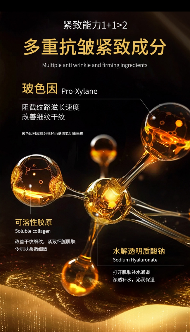 在核心专利成分之外,配方师对辅助成分的选择呈现出清晰的“承托层”构建思路。神经酰胺 NP的加入,直接作用于角质层间隙,帮助维持屏障结构的完整性,为后续成分的稳定渗透创造基础条件。水解透明质酸钠则以超低分子量形态,渗透至表皮深层,形成持续的水分储备,避免肌肤因干燥而加速纹路显现。此外,腺苷作为能量补充因子,参与肌肤自身的代谢调节,与核心抗老成分形成时间维度上的接力——短期充盈与长期支撑并行不悖。