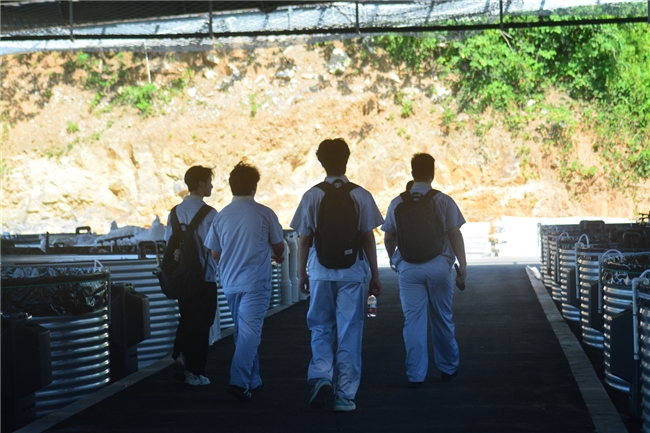 调研伊始,团队成员深入庆渔堂现代化水产养殖基地进行实地考察。宽阔整齐的标准化养殖池内水体循环有序,增氧设备持续运转,现场呈现出高度规范化、设施化的生产场景。技术人员向同学们详细介绍了养殖系统的运行机制,包括水质调控、溶解氧管理以及循环水处理等关键环节。