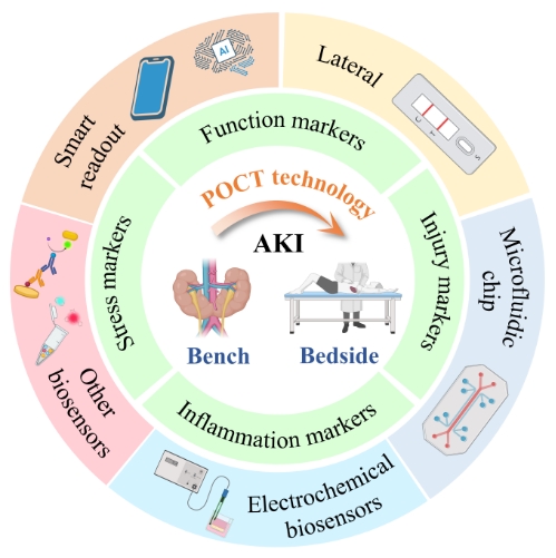 本次发表的综述论文,系统梳理了急性肾损伤(Acute Kidney Injury, AKI)在早期诊断领域的最新研究进展,重点聚焦生物标志物筛选评价与床旁即时检测(Point-of-Care Testing, POCT)技术平台的开发应用,深入剖析了基础科研成果向临床实践转化过程中的核心挑战(图1)。