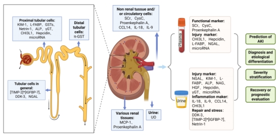 图2 生物标志物在AKI中的空间起源、生物学功能及临床应用价值