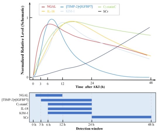 图3 肾损伤后关键AKI生物标志物的时间动力学特征及检测窗口期