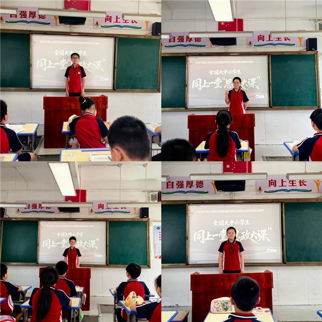 在观看过程中,同学们神情专注,不时记录下触动心灵的瞬间。老师们也结合课程内容,引导学生思考新时代青少年应如何传承和弘扬抗战精神,把爱国情、强国志、报国行融入日常学习与生活中。听完本次思政大课,六年级学生张嘉睿感悟到“和平来之不易”。几位五六年级的学生都提及,自己要在日常的学习和生活中完成好自身的本职任务,像先辈一样不畏艰苦,不怕困难,努力解决问题,坚持到底。