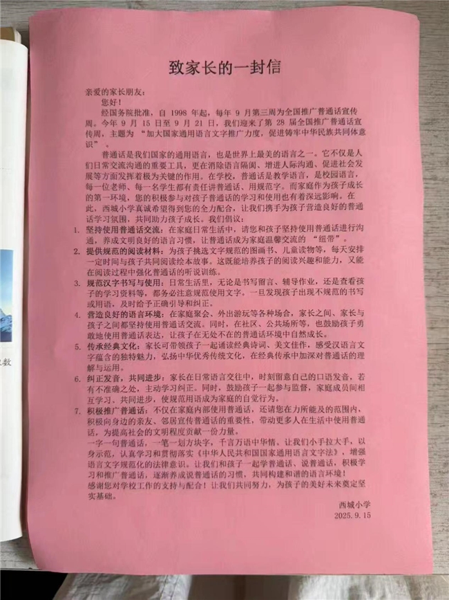 西街小学向家长发放活动告知信,倡导家庭共同参与普通话推广,形成家校共育合力。