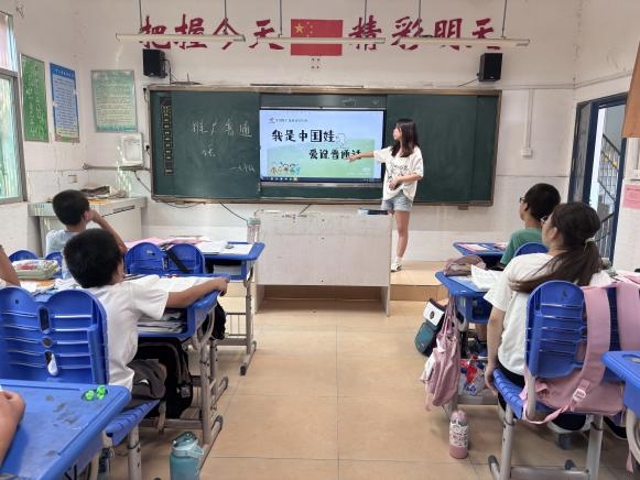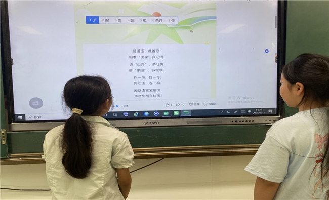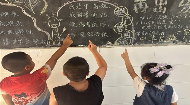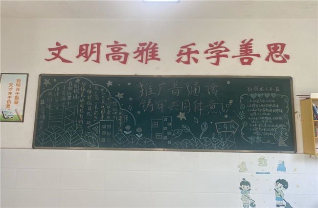 校园里的推普氛围,在电子显示屏与黑板报的呼应中格外浓厚。电子屏上,“加大国家通用语言文字推广力度,促进铸牢中华民族共同体意识”“讲普通话,写规范字,用文明语”的标语循环闪动,教室后的推普黑板报更是内容丰富,号召大家将规范用语融入课堂回答、课间问候等日常。一屏一板,一动一静,共同传递着推普理念,让文明用语的种子在校园里悄然扎根。