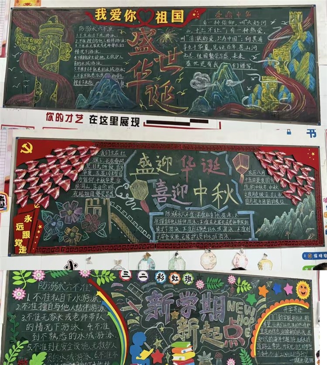 各班级黑板报紧扣主题,内容涵盖红色文化、校园生活、成长感悟等,布局合理、色调和谐。部分班级通过师生共同创作,将绘画、书法与文字结合,体现了“自主创新”的评比要求。