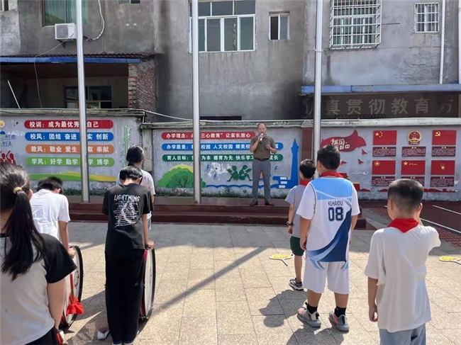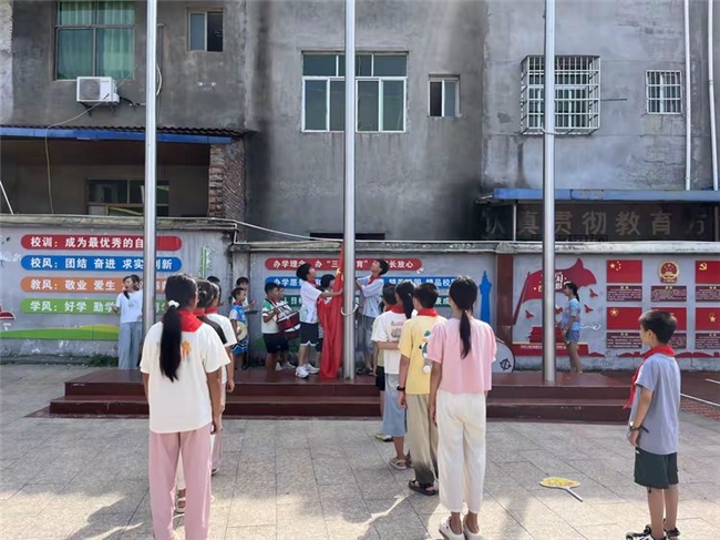 9月4日上午,学校举行庄严的升旗仪式。在雄壮的国歌声中,五星红旗冉冉升起,全体师生行注目礼,少先队员敬队礼。校长在国旗下发表讲话,以“从‘小米加步枪’到‘大国重器’”为主题,对比抗战时期的艰苦条件和今日祖国的强盛,激励学生铭记历史、奋发图强。校长还希望同学们新学期有新的开始,新的面貌,爱党爱国,努力学习,积极锻炼,热爱劳动,养成良好的生活和行为习惯 ,成为新时代合格少年,并要求同学们树立安全第一的观念,增强安全意识,牢记防溺水六不准,遵守交通规则,掌握应急自救方法。六年级学生代表袁宇佳以“铭记光辉历史,开启崭新征程”为主题进行发言,并且告诉全体学生“我们要像阅兵式上的战士一样,挺直脊梁,为中华之崛起而读书!”