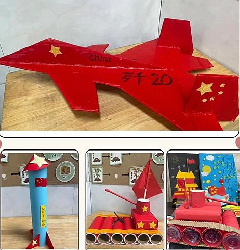 手工课上,同学们化身“小小匠人”。彩纸在手中折叠、剪裁,变成了一个个精致的五角星;黏土被捏塑成天安门、华表的模样,细节处尽显用心;还有同学用废旧材料制作“祖国山河图”,用瓶盖拼出“我爱中国”的字样。每一件手工作品,都凝结着对祖国的巧思与深情,仿佛在诉说:“我们用双手,为祖国母亲献上特别的礼物。”