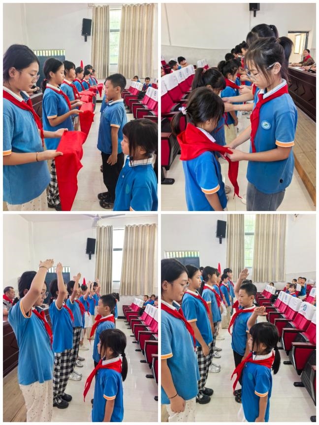 在队旗的见证下,分批入队仪式庄严举行。二(1)中队的王梓乐、宁浩研、宁皓洋等新队员昂首挺胸,接过属于他们的红领巾。老队员们亲手为他们佩戴,红色的三角巾在胸前展开,像一团团温暖的火焰,照亮了童年的梦想与使命。在嘹亮的誓言中,新队员们正式加入少先队,开启了属于自己的红色征程。
