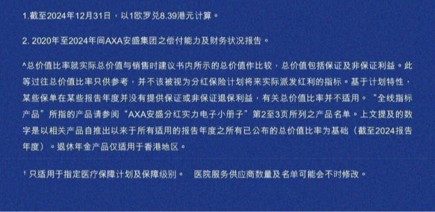总价值比率就实际总价值与销售时建议书内所示的总价值作比较,总价值包括保证及非保证利益。此等过往总价值比率只供参考,并不该被视为分红保险计划将来实际派发红利的指标。基于计划特性,某些保单在某些报告年度并没有提供保证或非保证退保利益,有关总价值比率并不适用 。上文提及的数字是以相关产品自推出以来于所有适用的报告年度之所有已公布的总价值比率为基础(截至2024报告年度)。