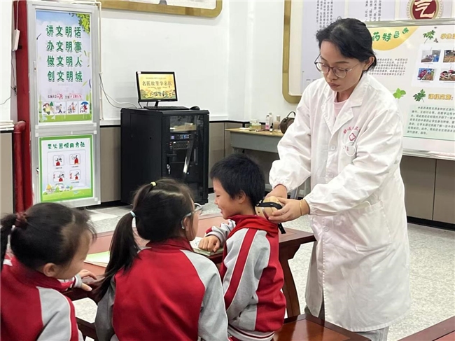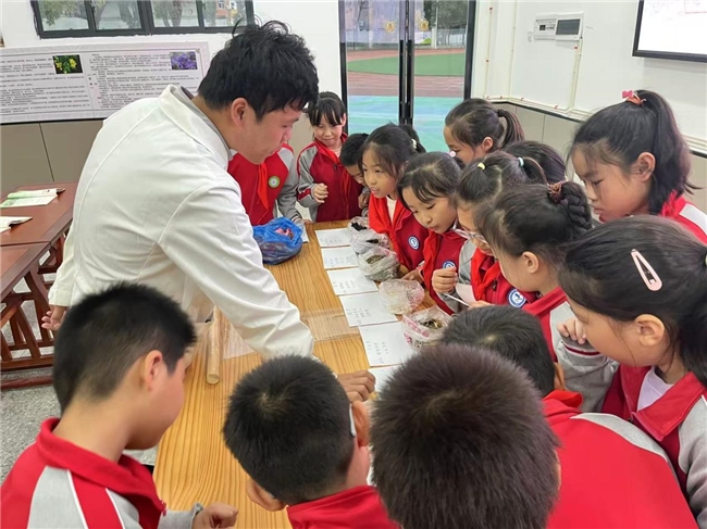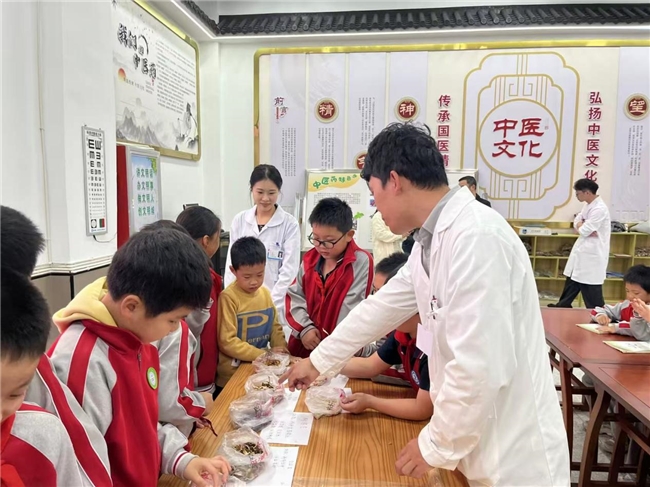 “耳闻之不如目见之,目见之不如足践之,足践之不如手辨之。”随后,在胡江医生的带领下,同学们来到精心布置的中药展示区,开启了一场认识常见中药的探索之旅。展示台上,摆放着各种各样的中药材,有散发着淡淡清香的蒲公英、乌黑发亮的何首乌、金灿灿的黄芪、纹理清晰的茯苓……每一味中药,都介绍了它们的名称、来源、功效和用法。同学们好奇地观察着这些中药材,有的轻轻触摸,感受它们的质地;有的凑近闻一闻,辨别它们独特的气味。通过医生的讲解和自己的亲身体验,同学们对身边这些常见的中药有了更深入的了解,也惊叹于大自然的神奇,原来在我们生活的周围,隐藏着这么多能够治病救人的宝贝。