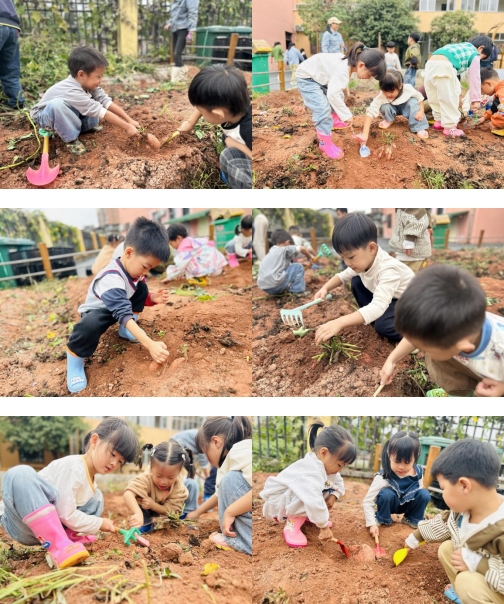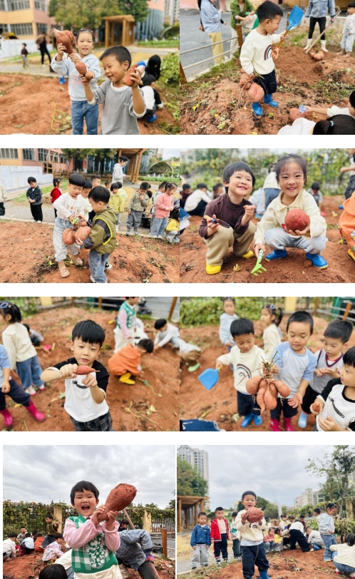 “我挖的红薯像葫芦娃!”“我挖的红薯身体圆圆滚滚的。” “这个红薯好大呀!这个好小哟!” 一个个大大小小、形状不一的红薯被孩子们挖了出来,虽然很累,衣服、鞋子、手上都沾满了泥土,但孩子们脸上洋溢着幸福的笑容。孩子们欢呼着、笑闹着,充分享受着丰收的喜悦和大自然赐予的美好......