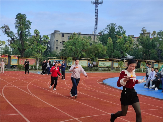 女子托乒乓球竞速赛更是妙趣横生。女教师们手持球拍,将小小的乒乓球稳稳托住,既要保证速度,又要维持平衡。她们或快步疾走,或小心翼翼,整个过程紧张刺激又充满了乐趣,充分展现了浒湾中学女教师的灵动与活力。