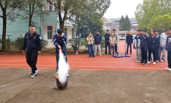 疏散结束后,派出所民警结合校园火灾特点,用通俗易懂的语言讲解了火灾预防要点、初期火灾处置方法等关键知识。在灭火器实操示范环节,民警详细拆解了灭火器“提、拔、握、压”的使用步骤,强调了操作时的安全注意事项,并现场演示灭火过程,火焰在干粉喷射下迅速熄灭,让学生直观感受灭火器的使用效果。