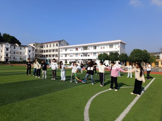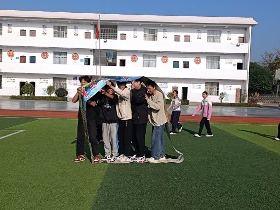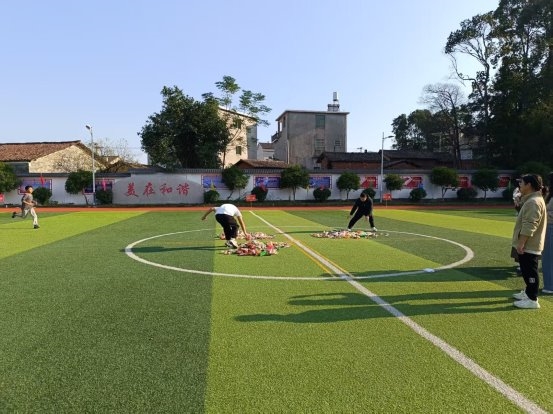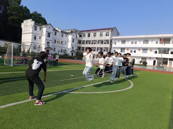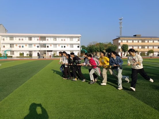 开幕式后,紧张而有趣的比赛正式展开。上午的项目以集体趣味运动为主,旨在锻炼协作精神。“齐心协力过障碍跑”考验着同学们的默契与速度,场上队员相互扶持,灵活穿越;“二分钟跳大绳”则是节奏与配合的完美呈现,长绳翻飞,身影灵动,每一次成功的衔接都引来欢呼;“车轮滚滚”项目中,队员们协调一致,推动“履带”稳步向前,场面妙趣横生;“呼啦圈过山车”、“保龄球”则结合了技巧与趣味,呼啦圈的传递与保龄球的撞击,充满了意外的惊喜与欢笑。这些项目不仅缓解了学习的压力,更在轻松愉快的氛围中深化了同学们的团队意识。