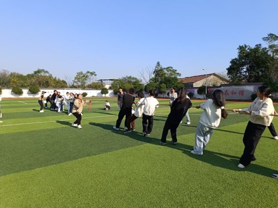 赛场不仅是学生的舞台,也是老师们展现风采的天地。教职工们按文、理科分为两队,参加了保龄球、投壶和拔河三个项目的友谊赛。在保龄球和投壶项目中,文科组的老师们技高一筹,凭借稳定的发挥和精准的控制,取得了大比分领先,展现了细腻与沉稳。而在力量对抗性更强的拔河比赛中,理科组的老师们则展现出强大实力,以碾压性的优势赢得了胜利。赛场上的老师们褪去了平日的严肃,尽情投入,他们的参与不仅拉近了师生距离,更用实际行动诠释了拼搏与乐趣的真谛。