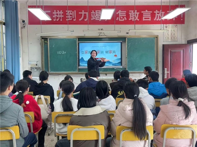 课堂上,黄老师利用本地教育资源,结合东汉杨震“四知拒金”的经典典故,联动本地杨氏后裔坚守勤俭、清白做人的现实案例,生动阐释优良家风的育人价值,引导学生挖掘自家家风亮点,主动参与制定家规,将孝亲敬老、勤俭节约等美德融入日常。互动环节中,同学们积极分享家庭故事,对家风传承的意义有了更深刻的理解。