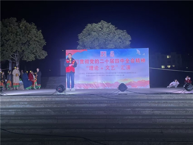 为深入学习贯彻党的二十届四中全会精神,丰富居民群众精神文化生活,2025年11月30日晚,由乐安县新时代文明实践中心、乐安县委组织部、乐安县城市社区管理委员会、芙蓉社区新时代文明实践站、乐安援手义工协会联合主办的学习贯彻党的二十届四中全会精神“理论+文艺”汇演在四九广场举办。