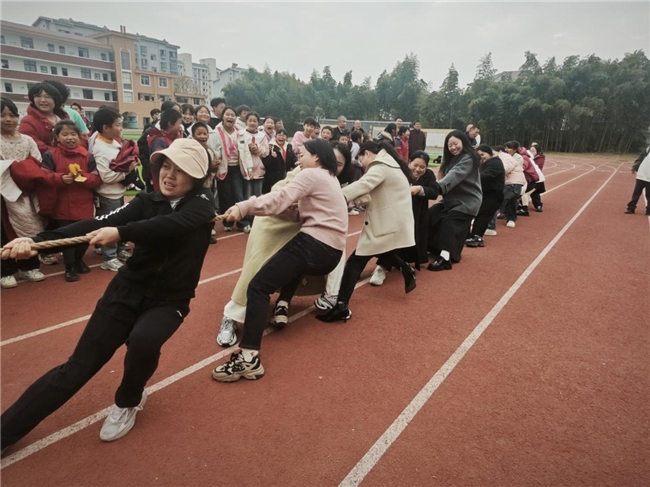 教师拔河比赛: 将运动会气氛推向高潮的当属教师拔河比赛。各年级组教师代表队全力以赴,奋力拼搏;学生们自发组成啦啦队,为老师们呐喊助威。赛场上下欢声笑语、激情澎湃,充分体现了师生同乐、和谐融洽的校园氛围。